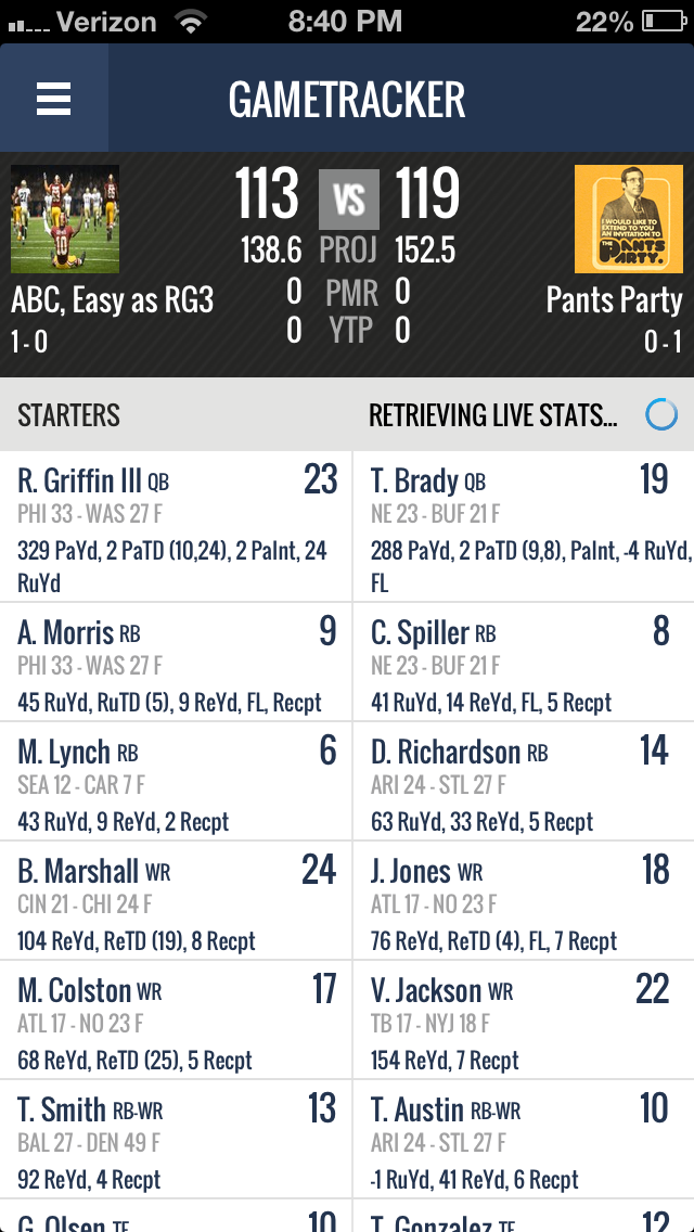 I never thought I would have a fantasy football team. I really never thought I would wake up at 3am and think…how many points did RG3 get me? Well. That is me. And I lost by 6 points. SIX. Yes, it is the first week, but I can see already why my husband is obsessed with this and why it may ruin his Sunday. (Side note: Dave is a HUGE Redskins fan and has turned me into one too). Excited for this football season and ready to win this! HAIL.
