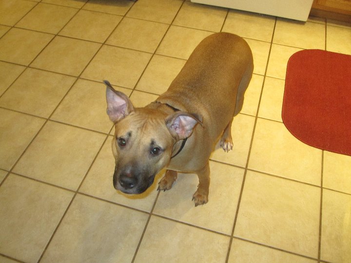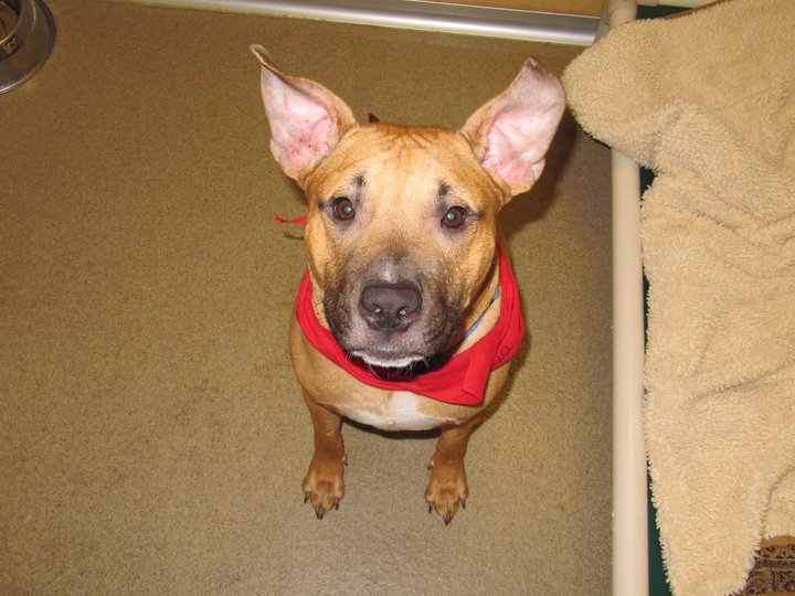 After walking around a few times, we asked to see Brad and a puppy. The puppy came in first and was so cute but was biting everything (it is a puppy! ha) and the woman said he would probably be even bigger then Brad. So she brought Brad in and I fell in love instantly. He was playing and jumping around and I remember him just laying his body against my legs and I said to Dave- I want him! Unfortunately, we do not know his whole background or his exact birthday- which is to be expected when you rescue a dog. He does have scars up and down his front arms and his head. They found him on a street in NY and a blessing to us, the SPCA up there was overflowing so B got sent down to NJ. We did ask the vet what she thought and she said she thought it was used as a bait dog…but of course we do not know the whole story. And we do not want to.